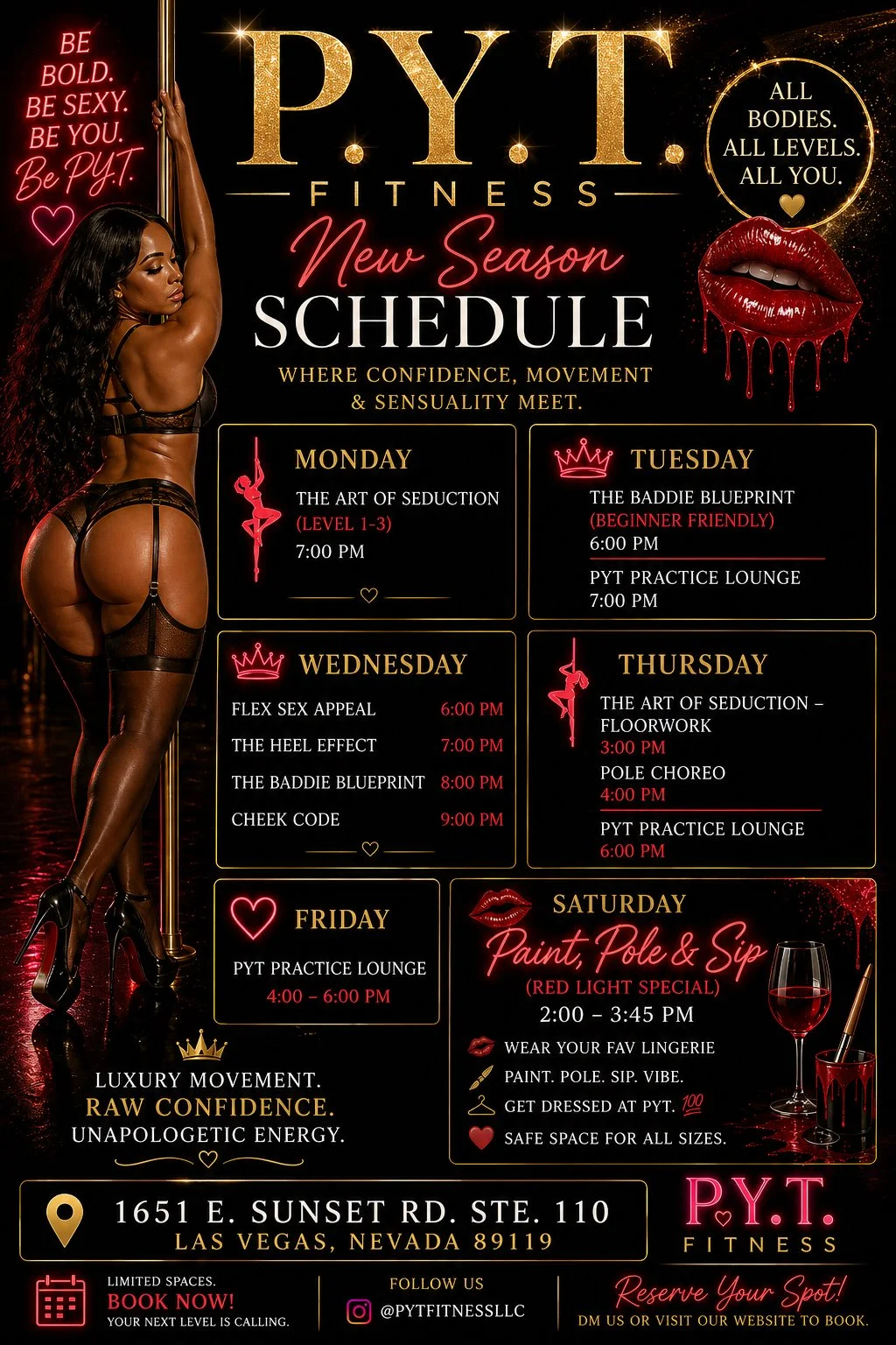 Come enjoy our fun and sexy, Pole/Yoga/Floorwork, and Twerk classes. Great for every part of your body. Fun for all ages, all sizes. Under 18 with parental signature. Take a look at our classes!